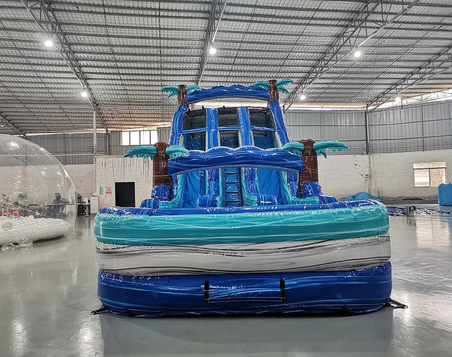 This super tall Slide has a deep landing. It is excellent for all your little ones, teens and adults. The climbing stairs are on the center of the slide. This allows all riders to slide on the left and on the right. Dimensions: 32.5ft L x 19ft W x 20Ft H Sprinkler is attached to slide and will need a water hose to be connected to. We apologize but water hoses are not supplied.
